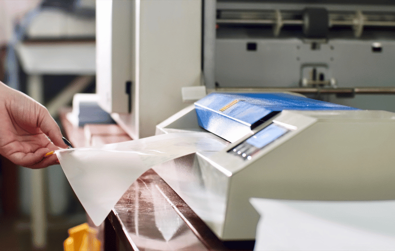 プリンターや手書きなどで書いた用紙を濡れたり破れたり汚したりしないようフィルムを使って丈夫にする技術のことを言います。